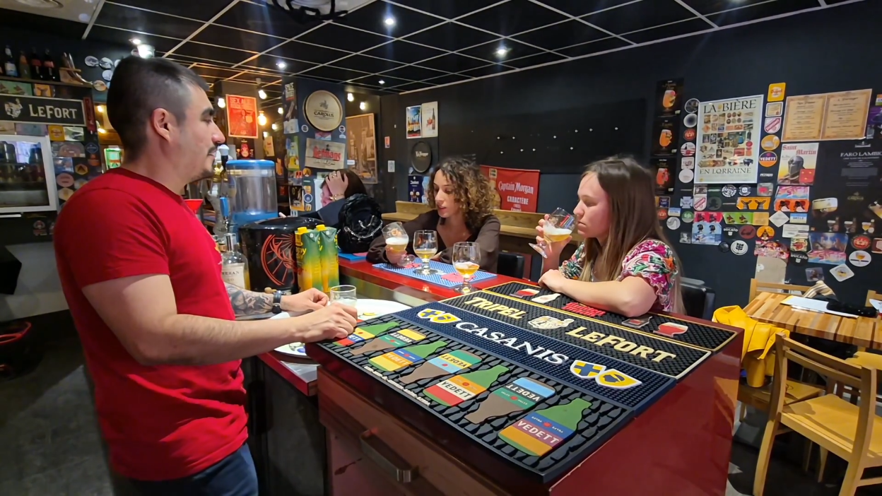 Deux jeunes femmes (C1 et C2) demandent à un serveur (S) comment il choisit les bières qui sont proposées dans son bar. Le serveur, qui est aussi brasseur, leur fait goûter plusieurs bières en leur donnant des informations sur la composition. Le serveur et les jeunes femmes donnent leur avis sur ce qu'ils préfèrent. | |
