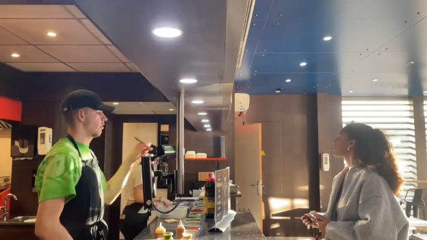 Un jeune femme (C) commande un repas dans un fast food. Le vendeur (V) prend sa commande et l'encaisse. | |